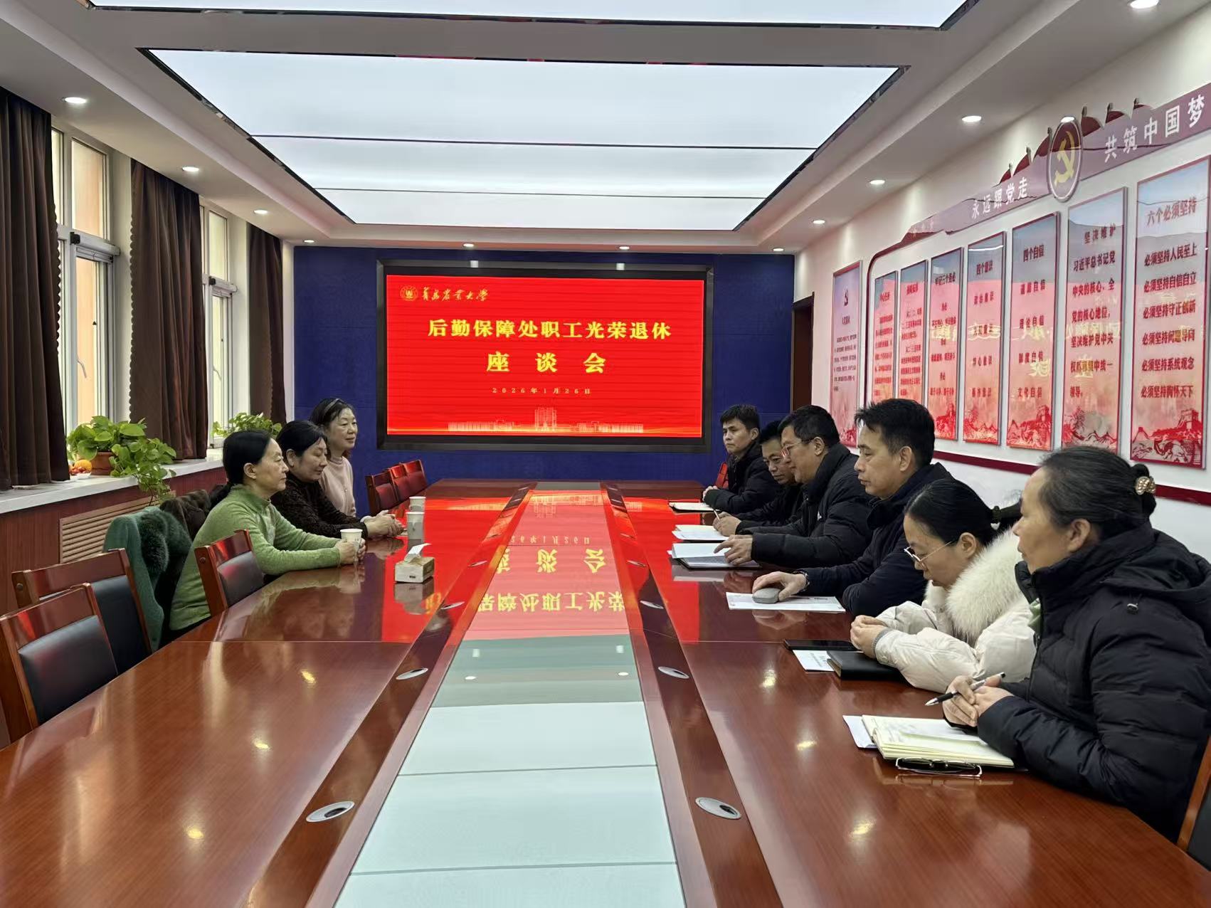 1月26日,后勤保障处在知行楼220召开职工光荣退休座谈会。党总支书记、处长陶飞参加座谈会并讲话,全体处领导参加,座谈会由副处长唐召杰主持。